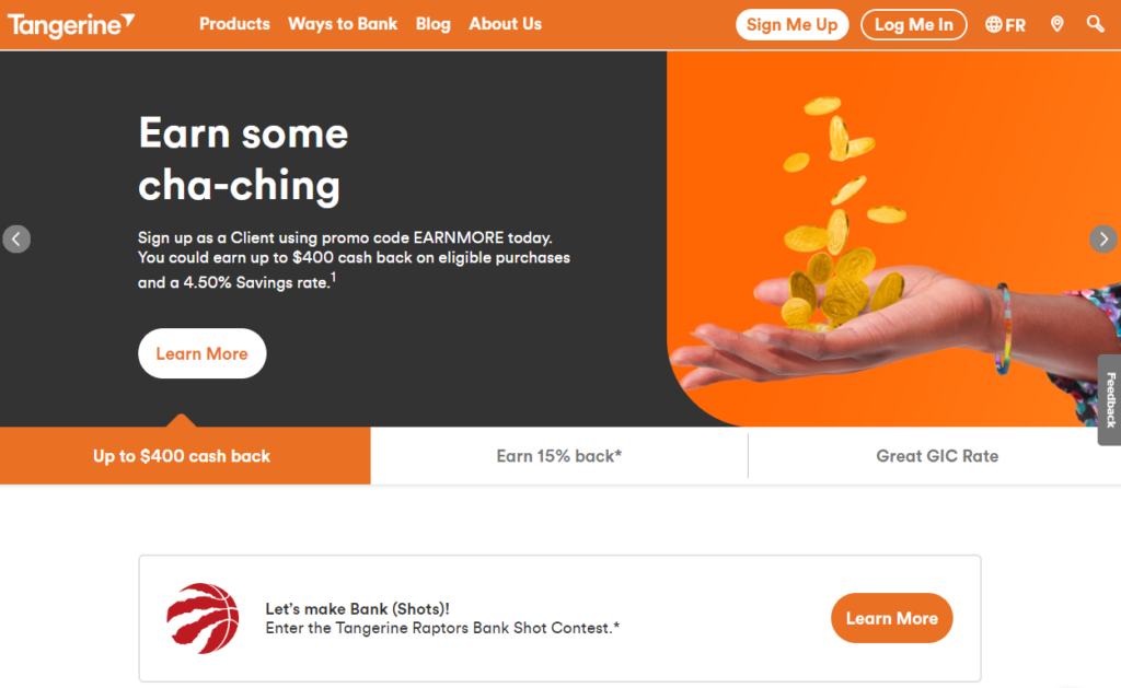 Tangerine offers high interest on the savings account, a chequing account with no fees on daily transactions, and credit cards with cashback rewards.