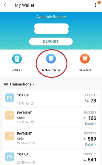 Open your Daraz app and navigate to the My Wallet section as before. Click on the Mobile Top-Up option.