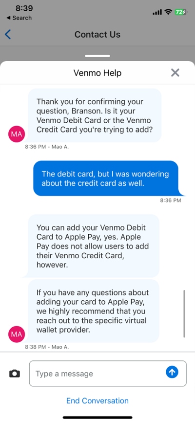 I reached out to Venmo support for help; it didn’t make any sense to me that Apple would stop you from adding a debit card to their service, regardless of where the card came from.